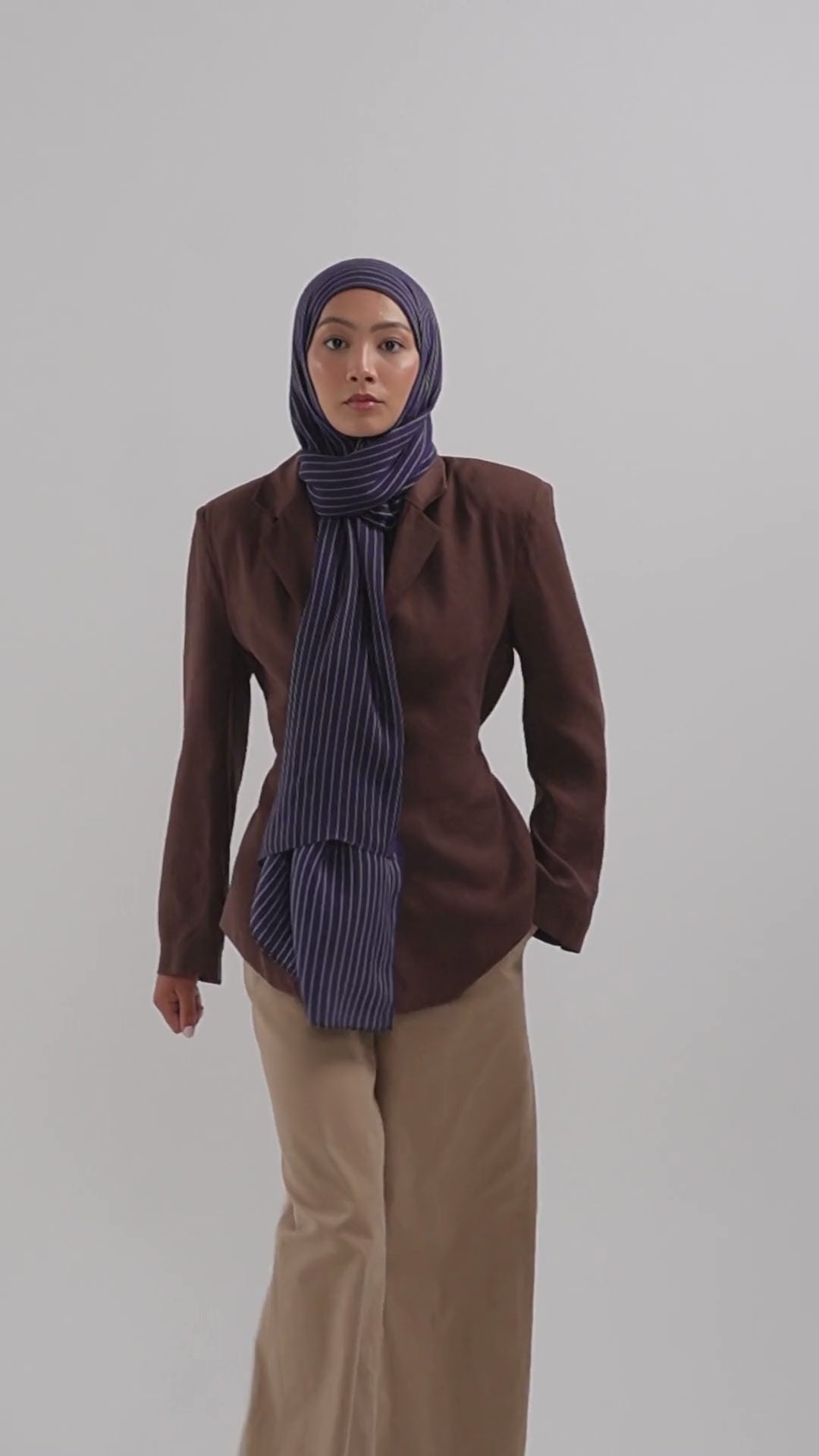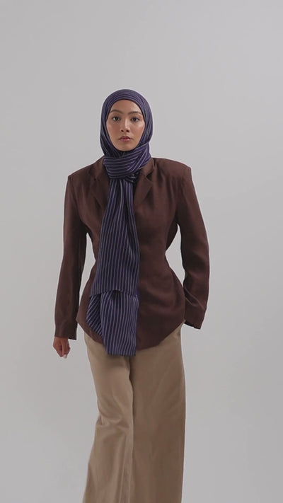 Élégance urbaine. Ce voile RAHA en modal premium se décline en bleu nuit, rythmé de fines rayures pinstripe couleur tabac qui allongent la silhouette. Doux, fluide et respirant, il conjugue confort et allure Tailoring, du bureau au soir.
